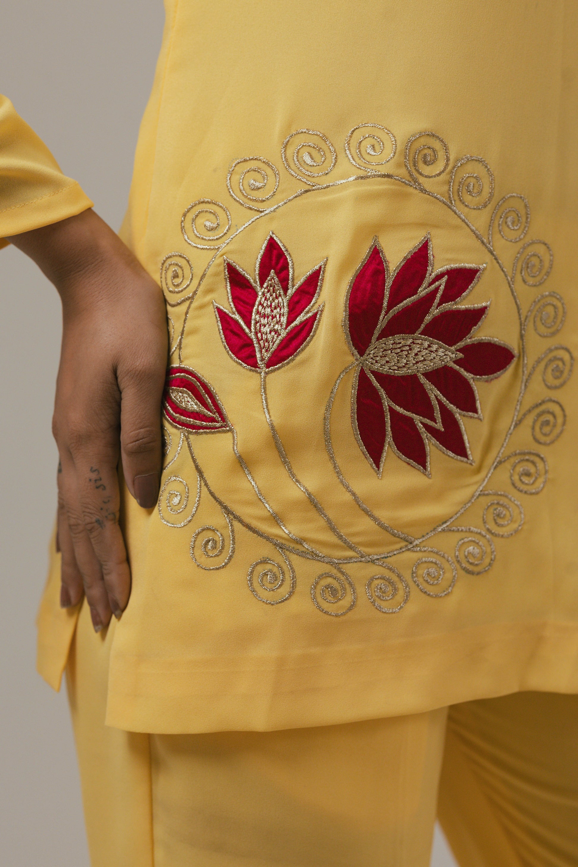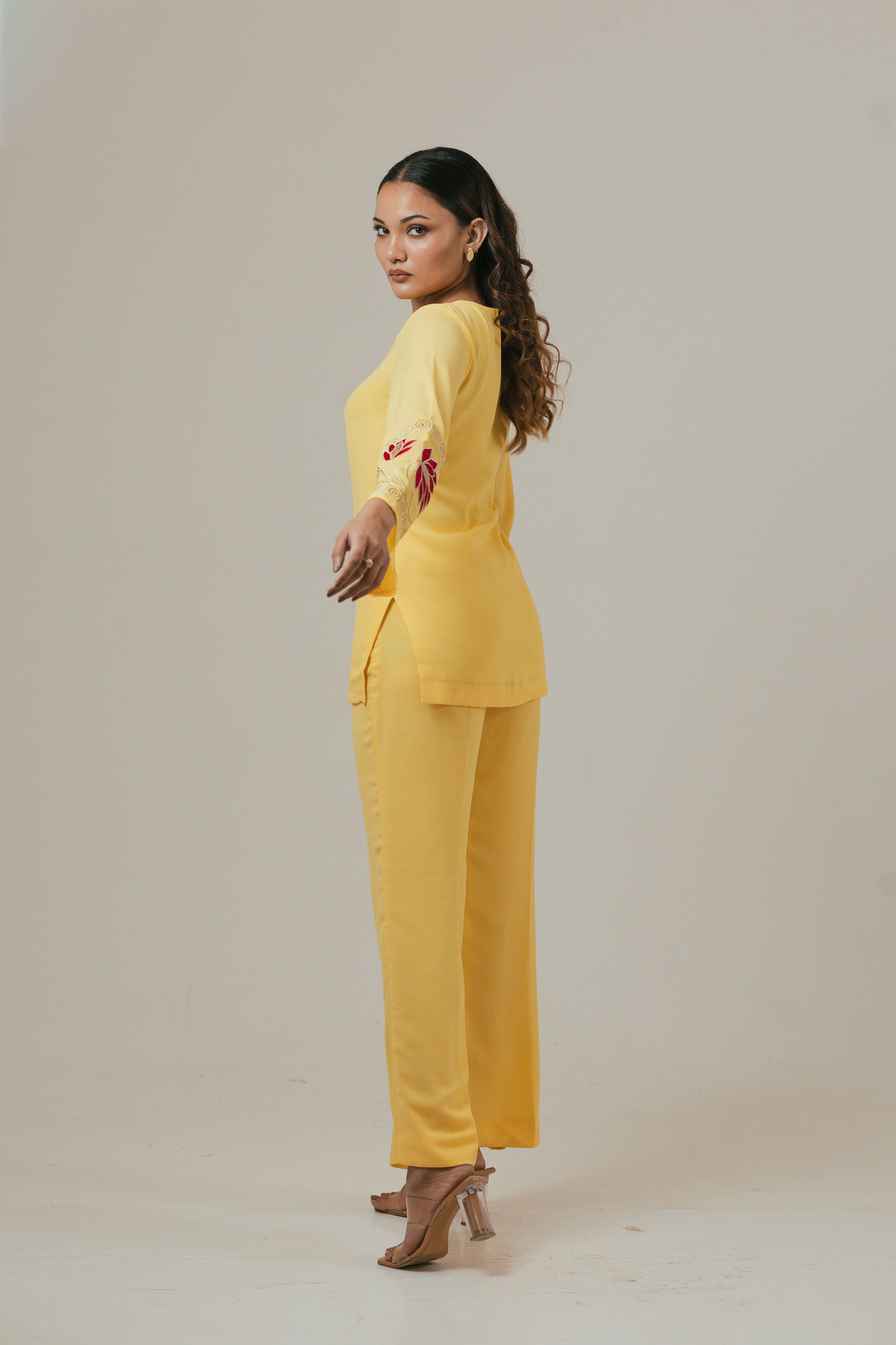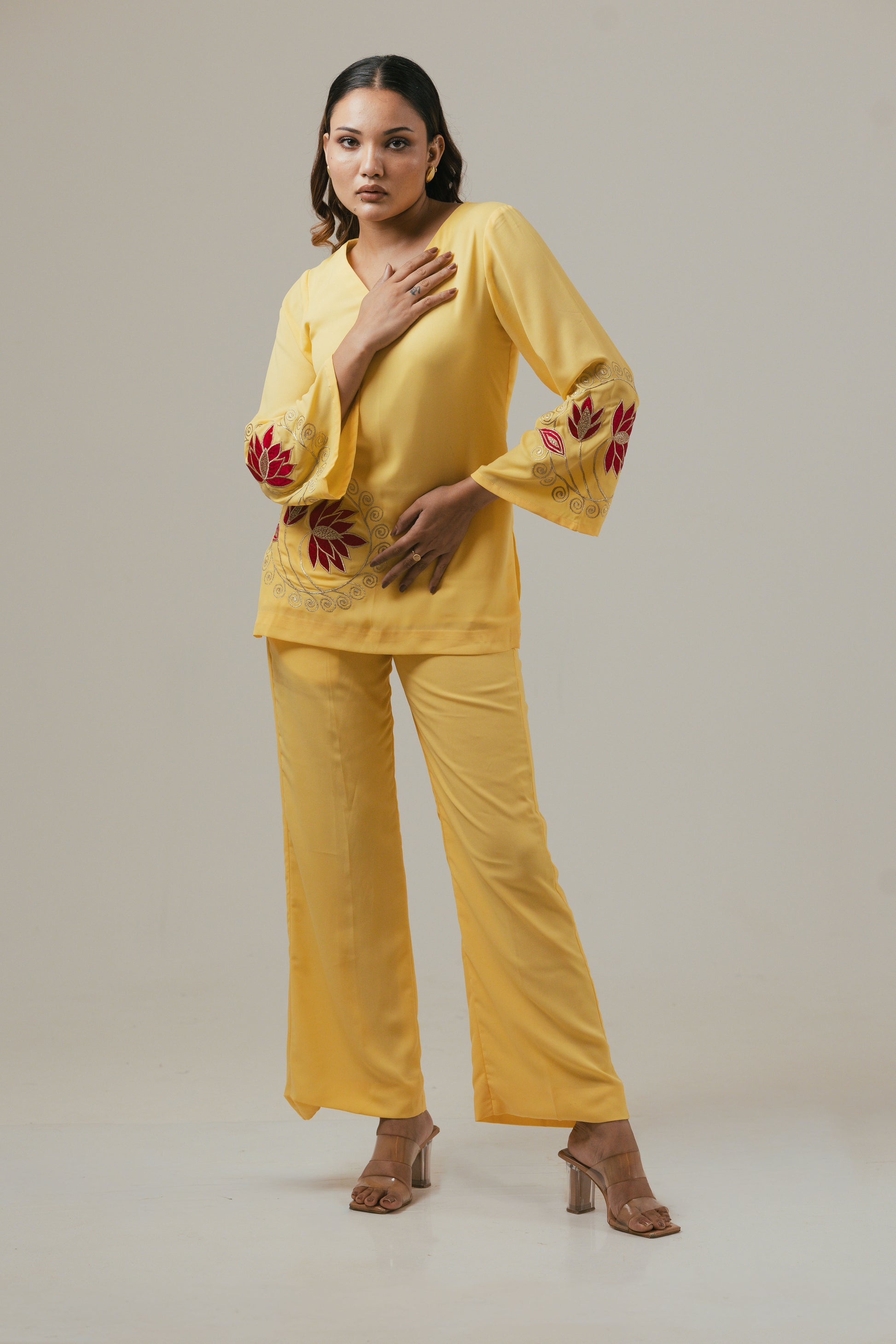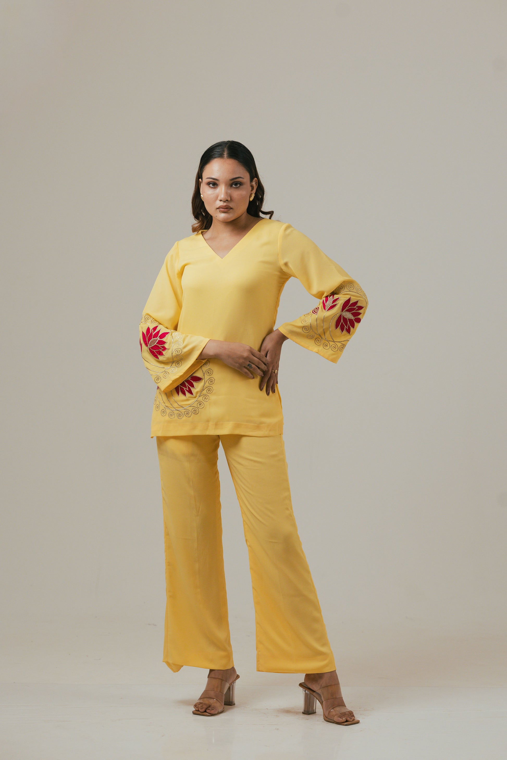 Brighten your wardrobe with this graceful 2-piece co-ord set in a refreshing sunshine yellow hue. Crafted from soft, flowy fabric, the V-neck top features intricate floral embroidery in contrasting pink and silver threadwork on the sleeves and hem, adding a touch of artistry and charm. Paired with comfortable straight-fit pants (length 41 inches), this ensemble is perfect for day events, festive gatherings, or elegant casual wear.