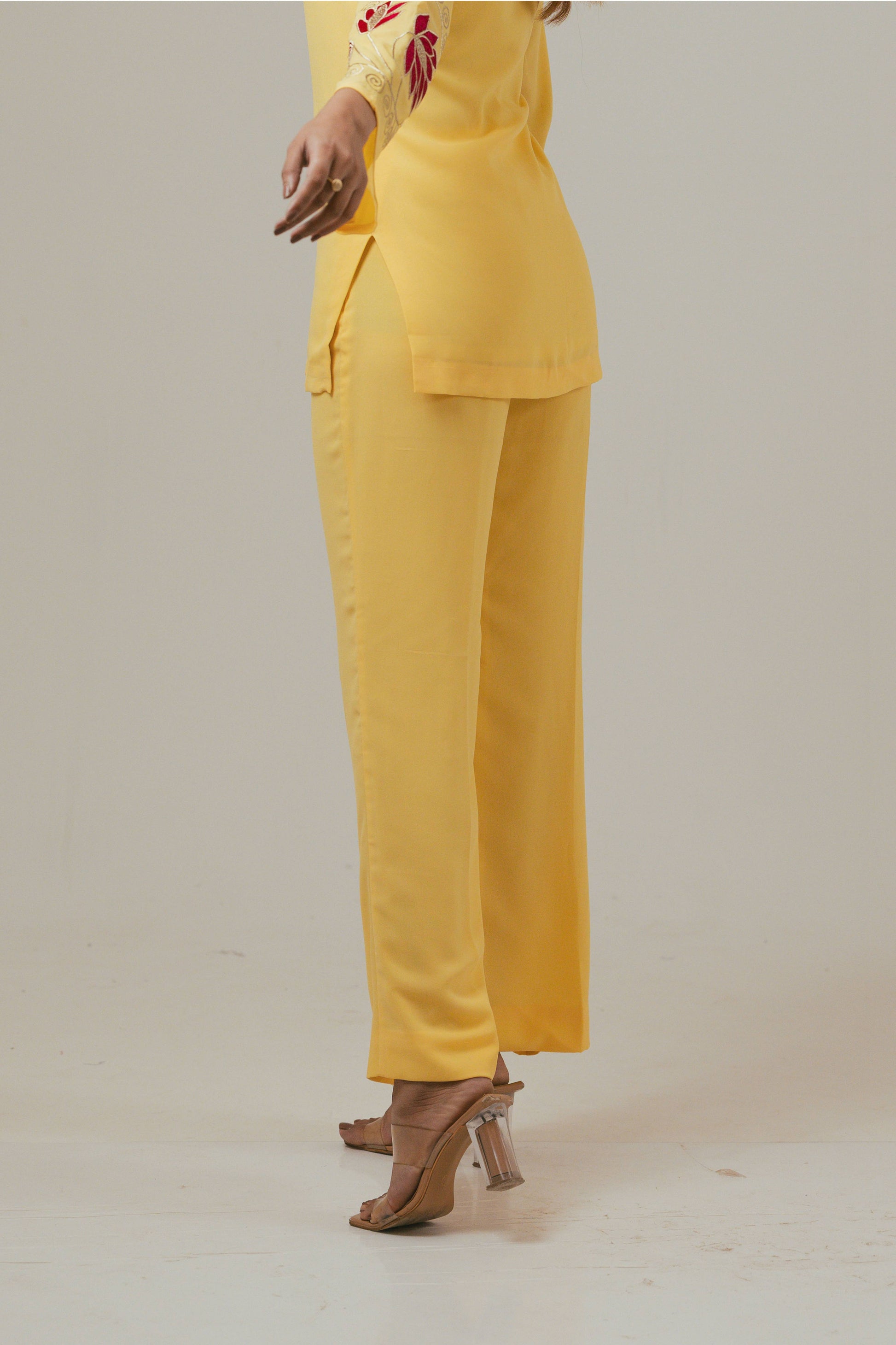 Brighten your wardrobe with this graceful 2-piece co-ord set in a refreshing sunshine yellow hue. Crafted from soft, flowy fabric, the V-neck top features intricate floral embroidery in contrasting pink and silver threadwork on the sleeves and hem, adding a touch of artistry and charm. Paired with comfortable straight-fit pants (length 41 inches), this ensemble is perfect for day events, festive gatherings, or elegant casual wear.