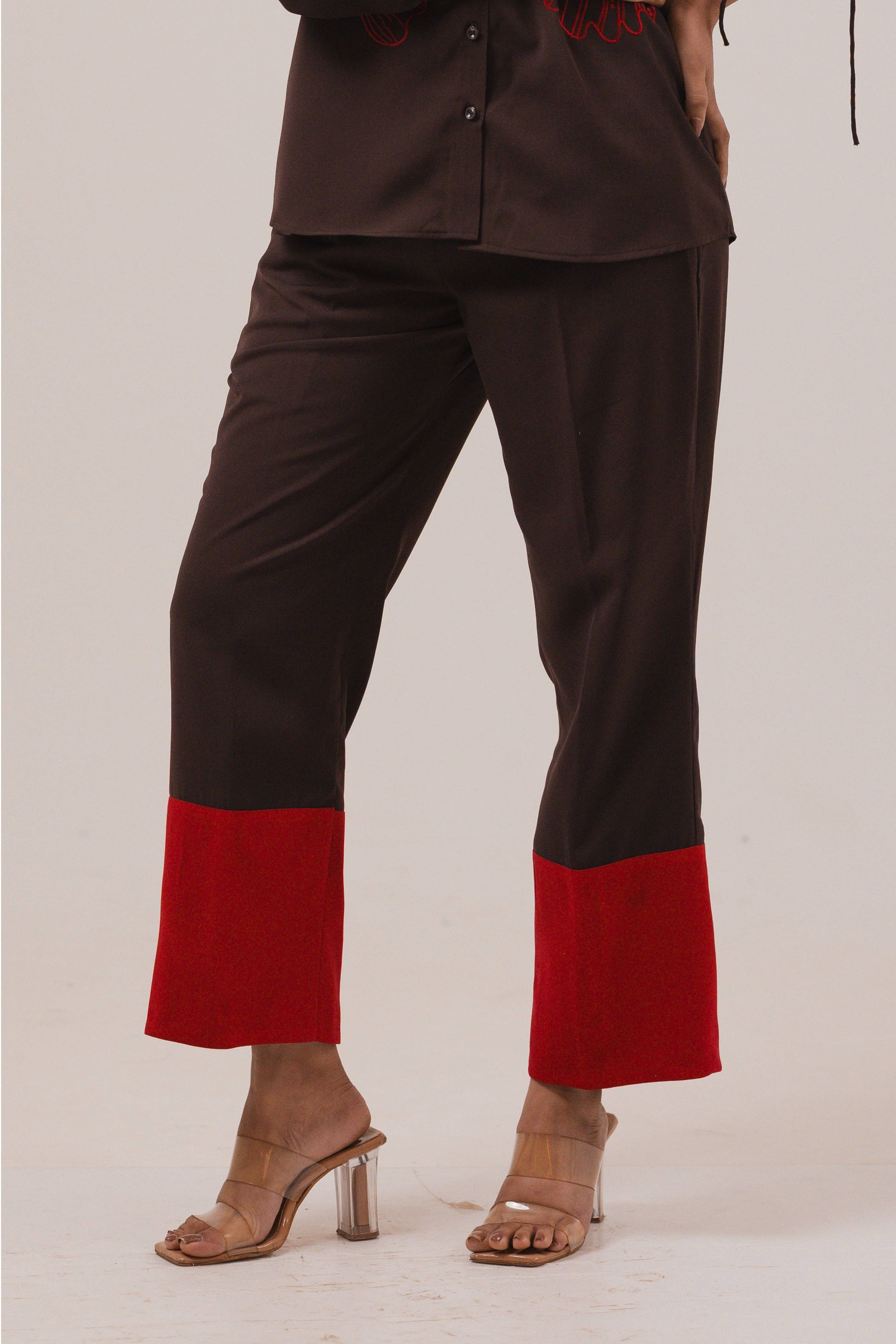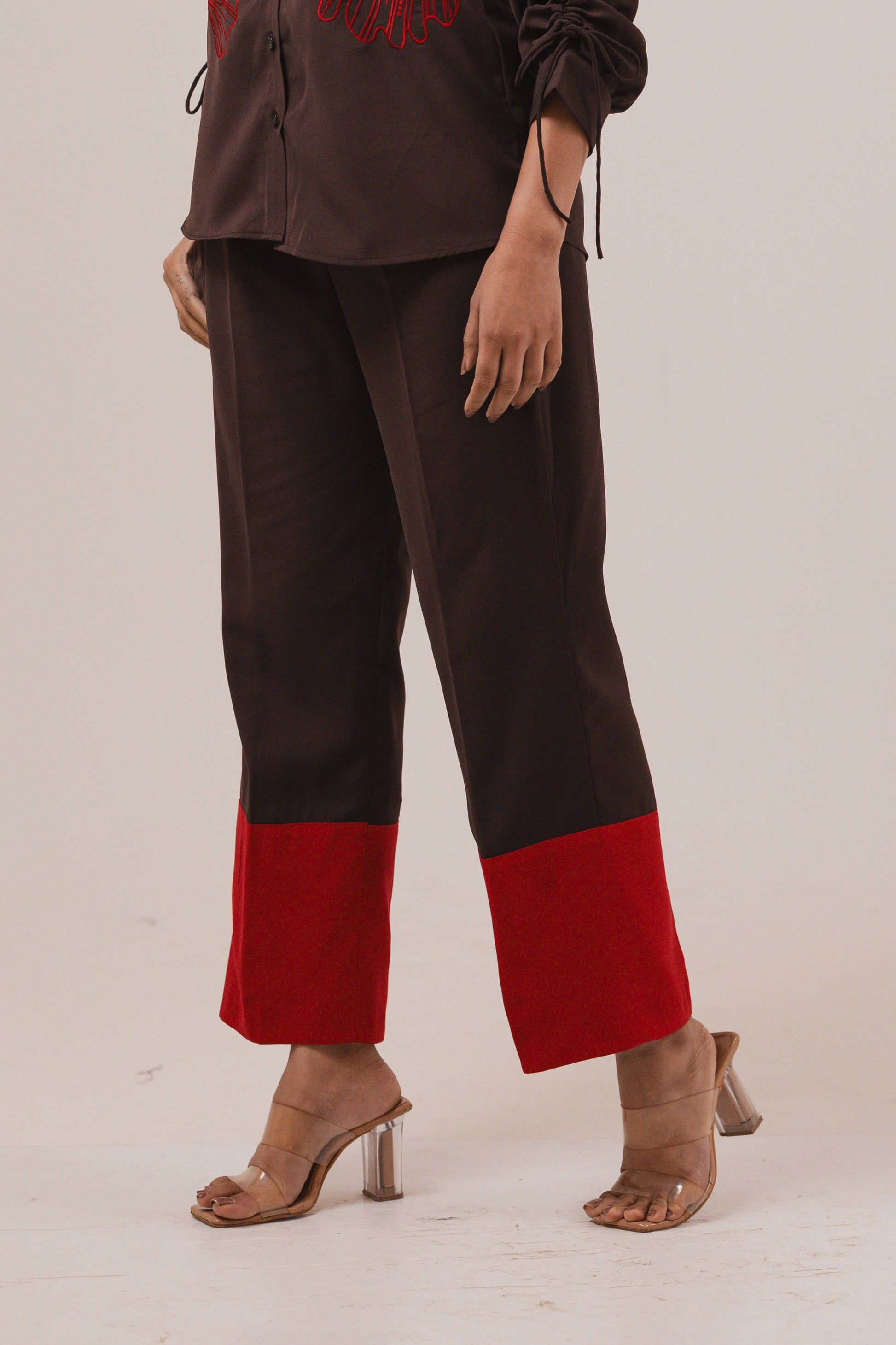 Make a bold yet elegant statement with this striking 2-piece co-ord set in rich chocolate brown, accentuated with vibrant red embroidery and contrast detailing. The collared shirt-style top (length 27 inches) features artistic red embroidered motifs along with gathered sleeves for a chic finish. Paired with straight-fit pants (length 41 inches) highlighted by a bold red block hemline, this ensemble is the perfect blend of modern sophistication and statement-making design. Ideal for festive gatherings, parties, o