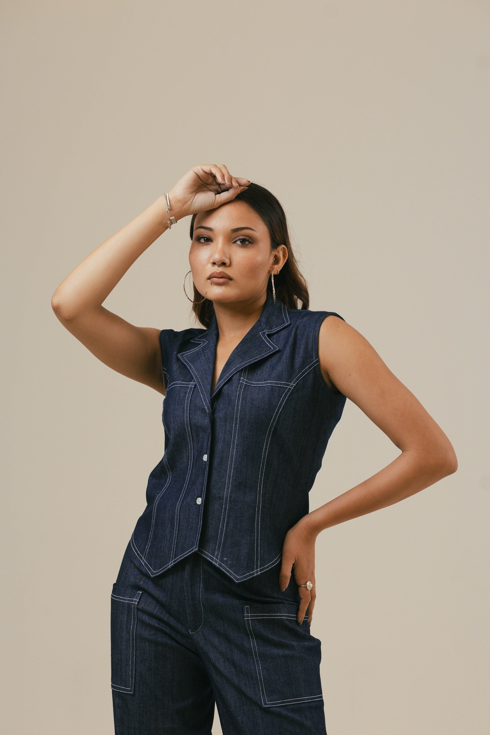 Step into regal elegance with this Royal Indigo Co-ord Set, crafted from rich dark denim. The ensemble features a sleeveless waistcoat-style top (length 27 inches) with a sharp lapel collar, structured tailoring, and bold contrast stitch detailing that exudes authority. Paired with straight-fit utility pants (length 41 inches), this co-ord blends royal sophistication with contemporary power dressing—perfect for evening soirées, luxury events, or anytime you want to make a commanding statement.