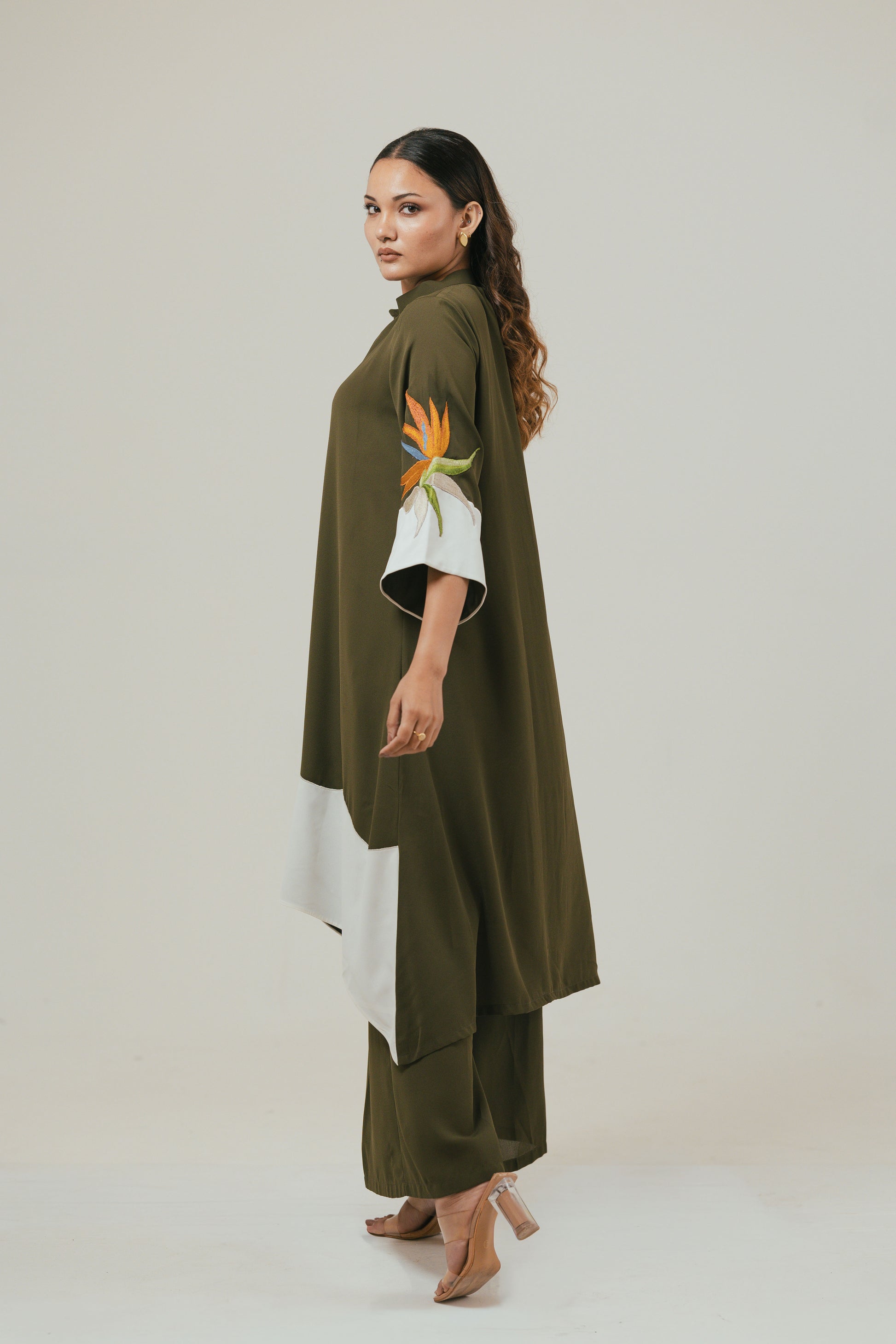 Step into effortless elegance with this 2-piece co-ord set in a refreshing olive green hue, beautifully contrasted with flowing white panels. The longline top (length 44 inches) features tropical floral embroidery on the sleeve and hem, inspired by the vibrant bird-of-paradise motif, adding a bold artistic touch. Paired with wide-leg pants (length 41 inches), this ensemble blends nature-inspired charm with contemporary sophistication, making it perfect for brunches, festive occasions, or statement daywear.