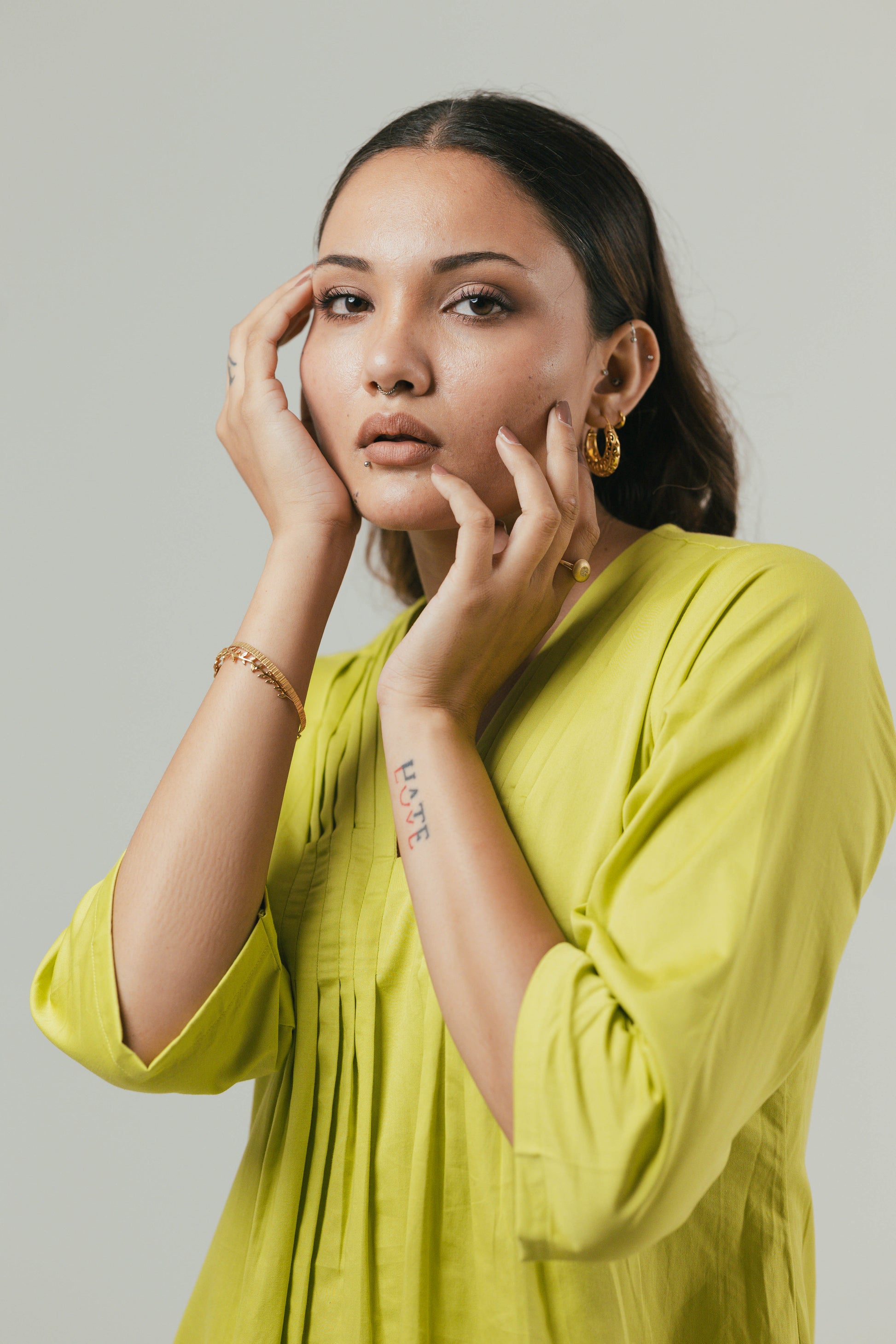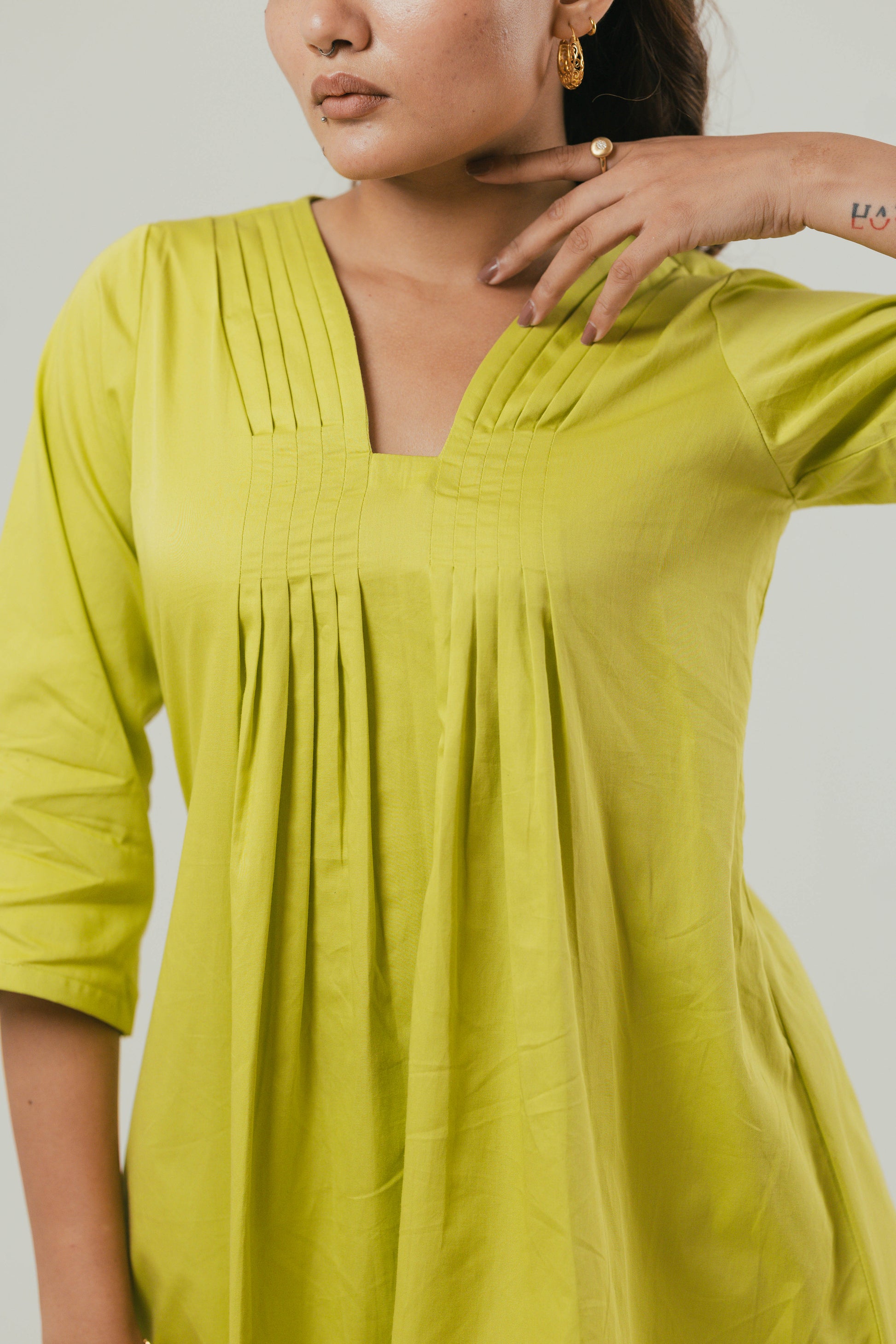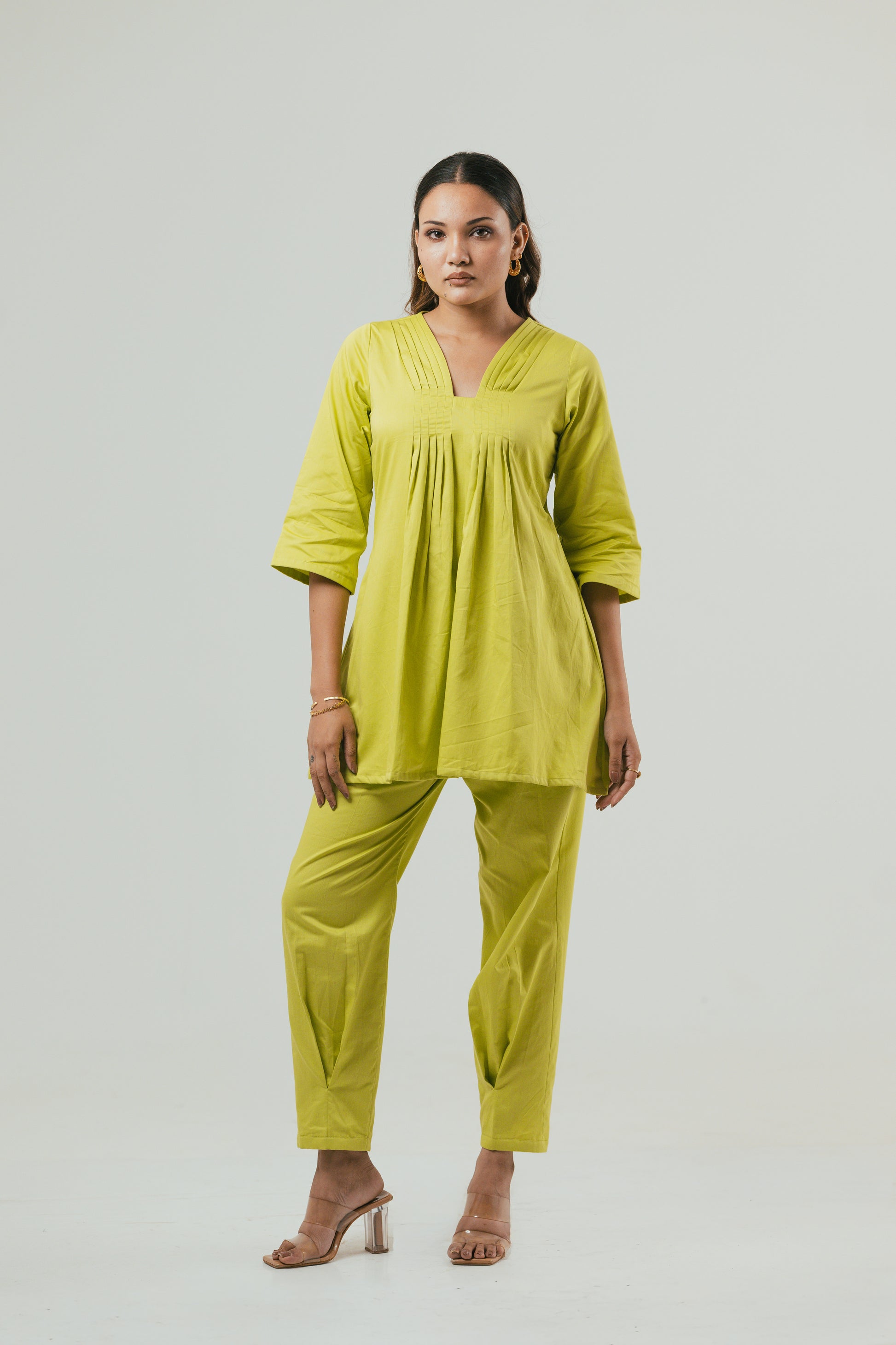 Brighten up your wardrobe with this refreshing 2-piece co-ord set in a vibrant lime green hue. The top (length 27 inches) features a V-neckline with delicate pleated detailing on the yoke and a relaxed fit for effortless comfort. Paired with straight-fit pants (length 41 inches) designed with subtle tuck accents, this ensemble is the perfect mix of minimal elegance and breezy style — ideal for casual outings, brunches, or day-to-evening wear.