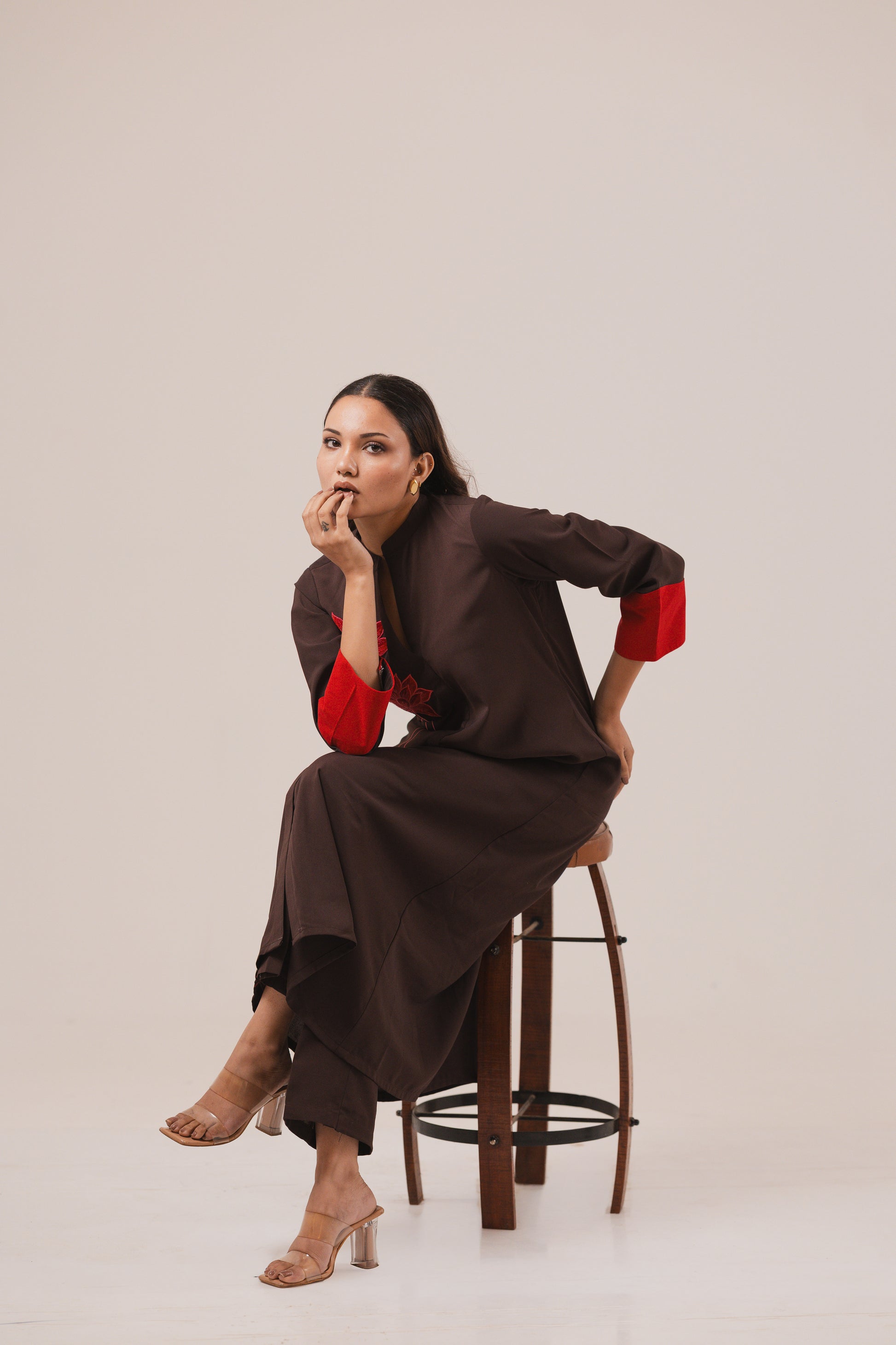 Elevate your festive style with this elegant 2-piece co-ord set in rich chocolate brown, beautifully accented with bold red floral embroidery on the front. The longline top (length 48 inches) fetures a mandarin collar, contrast red sleeve cuffs, and delicate vertical stitch detailing for a refined look. Paired with tailored straight-fit pants (length 41 inches), this ensemble blends traditional charm with contemporary sophistication, making it a perfect pick for festive occasions, cultural gatherings, and evening events.