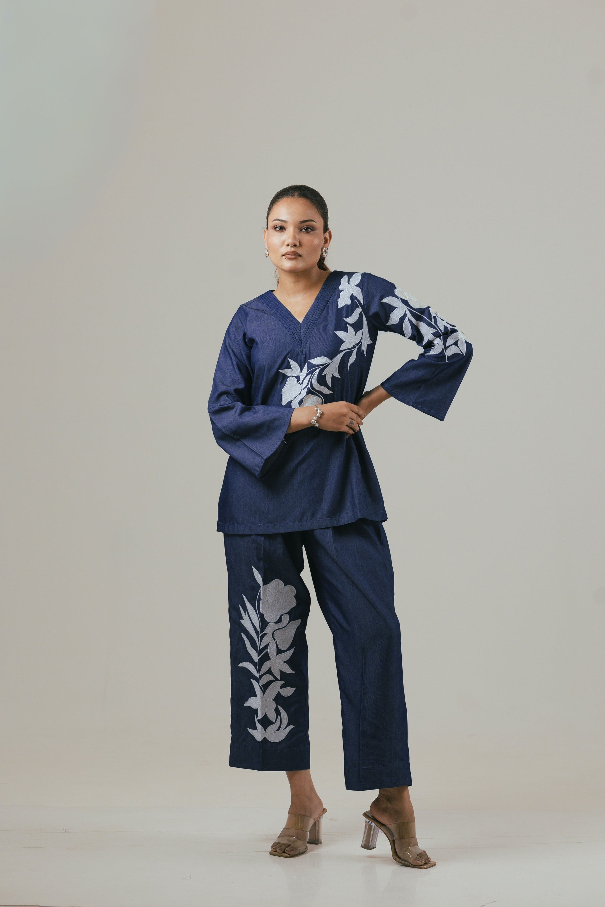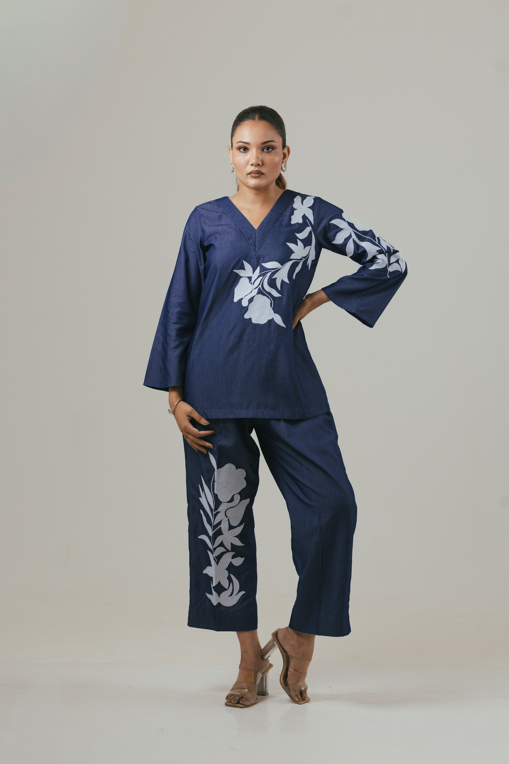 Make a statement with this elegant 2-piece co-ord set in premium linen denim fabric. Featuring delicate floral patchwork detailing, the set includes a stylish V-neck top (length 27 inches) and comfortable straight-fit pants (length 41 inches). The deep navy hue with contrasting floral motifs adds a touch of sophistication, perfect for both casual and semi-formal occasions.