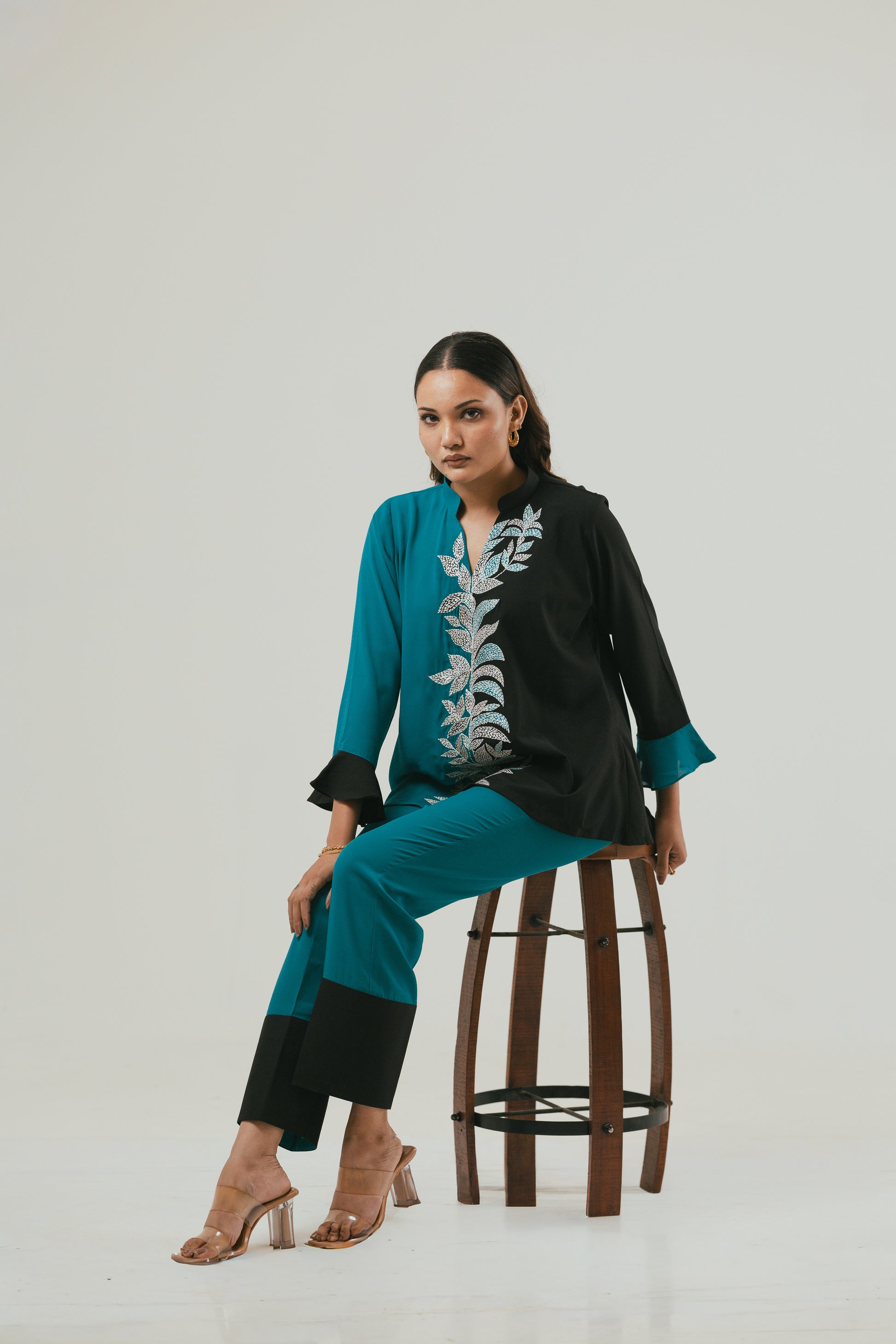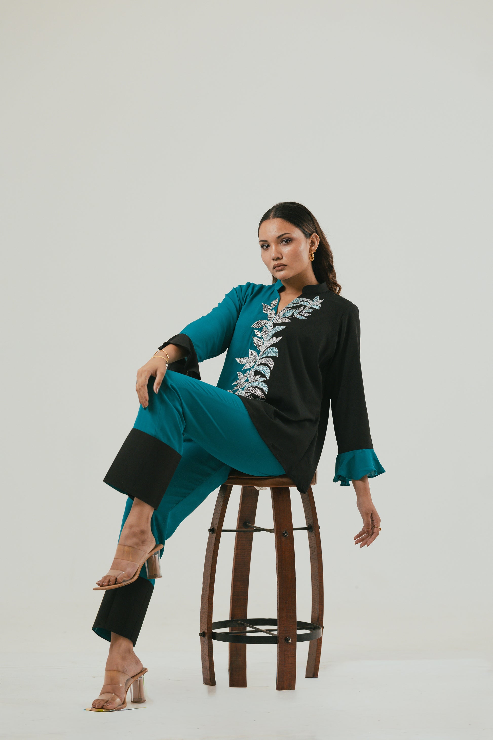 Exude timeless sophistication with this elegant 2-piece co-ord set in striking teal and black contrast tones. The chic top (length 27 inches) features a statement silver leaf embroidery cascading down the front, paired with flared sleeves finished in teal accents for a refined touch. Complemented by sleek straight-fit pants (length 41 inches) with bold black hem panels, this ensemble brings together regal elegance and modern design — perfect for festive occasions, evening gatherings, or luxury events.
