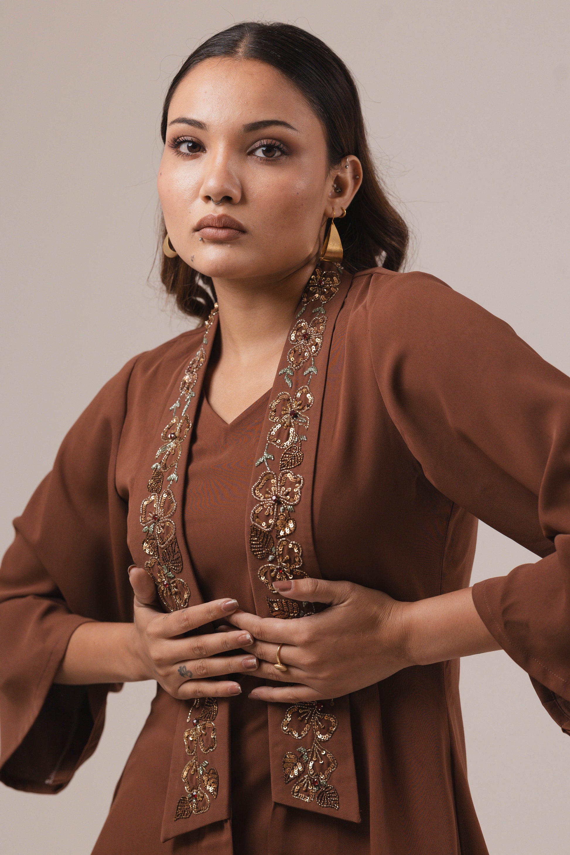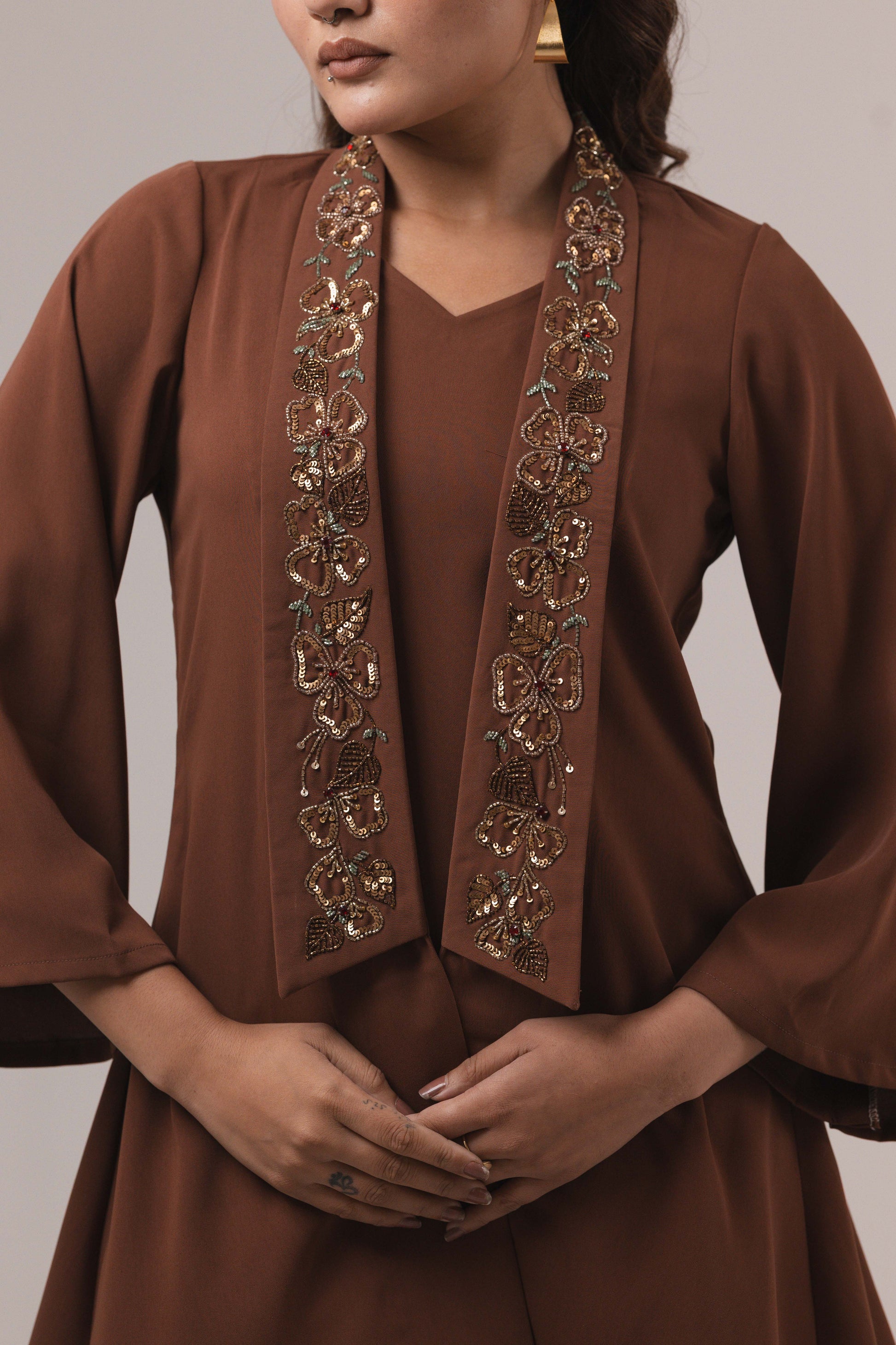 Bring festive elegance to life with this stunning 2-piece co-ord set in ivory crepe, beautifully highlighted with rich orange brocade detailing. The V-neck top (length 27 inches) features a stylish brocade yoke and cuffs, finished with delicate tie-up accents for a touch of tradition. Paired with straight-fit pants (length 41 inches) adorned with matching brocade borders, this ensemble strikes the perfect balance between modern sophistication and festive charm. Ideal for celebrations, parties, or elegant evening wear.